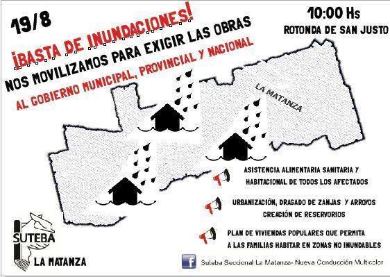¡Basta de Inundaciones! El 19 de agosto, a las 10 horas, en la Rotonda de San Justo. SUTEBA Seccional La Matanza convoca una movilización para exigir a los Gobiernos Nacional, Provincial y Municipal, las obras necesarias.