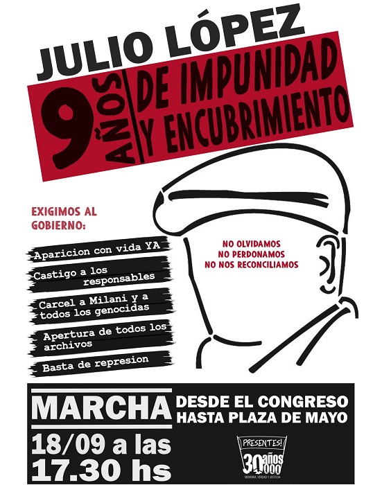 9 años sin Julio López 18 septiembre, 2015 A 9 años de la desaparición de Julio López marchamos de Congreso a Pza. de Mayo exigiendo su aparición con vida. Convocamos viernes 18 de septiembre a las 17:30hs en el Congreso. #9AñosSinJulioLópez Share