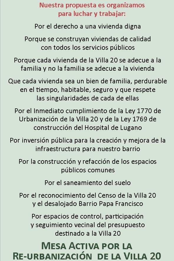 - Por el inmediato cumplimiento de la Ley 1770 de Urbanización de la Villa 20 y de la Ley 1769 de construcción del Hospital de Lugano