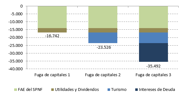 Por otra parte financió una galopante fuga de capitales, con la salida del llamado cepo cambiario y la liberación de la remisión de utilidades al exterior, abrió la puerta para una salida de dólares que se elevó a u$s 23.526 millones. Desde diciembre de 2015 las FAE (Formación de Activos Externos) del SPNF (Sector Privado no Financiero) se contabilizan en u$s 13.990 millones. Si a esa cifra se le adiciona la remisión de utilidades y dividendos al exterior, la fuga estimada desde diciembre de 2015 asciende a u$s 16.742 millones. Y si se agregan los egresos de divisas en concepto de turismo, la fuga de capitales total desde diciembre de 2015 ronda en torno a los USD 23.526 millones. El ratio de fuga de capitales (FAE+Utilidades+Turismo) sobre el nivel de Reservas fue del 6% para el año 2016. Finalmente, considerando el egreso neto por intereses, la suma asciende a u$s 35.492 millones. Aproximadamente el 70% de los compromisos en moneda extranjera y lo asignado a inversores externos se utilizó para financiar la fuga de capitales.