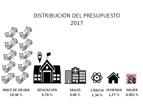 Con solo mirar el presupuesto 2017, el gobierno de Macri (y los votos del FPV-PJ y Massa en el Congreso que lo aprobaron), implica que se pagará deuda con menos educación, menos salud, menos desarrollo científico, menos viviendas, menos presupuesto para los problemas relacionados con la violencia de género, y con más despidos y ajustes salariales… Esto significa que uno de cada diez pesos que gasta el Estado Central se destinará a pagar intereses de la Deuda Pública, en promedio serán 680 millones de pesos por día (el costo aproximado de un hospital completamente equipado), o unos 30 millones de pesos por hora que pasa de nuestras vidas…