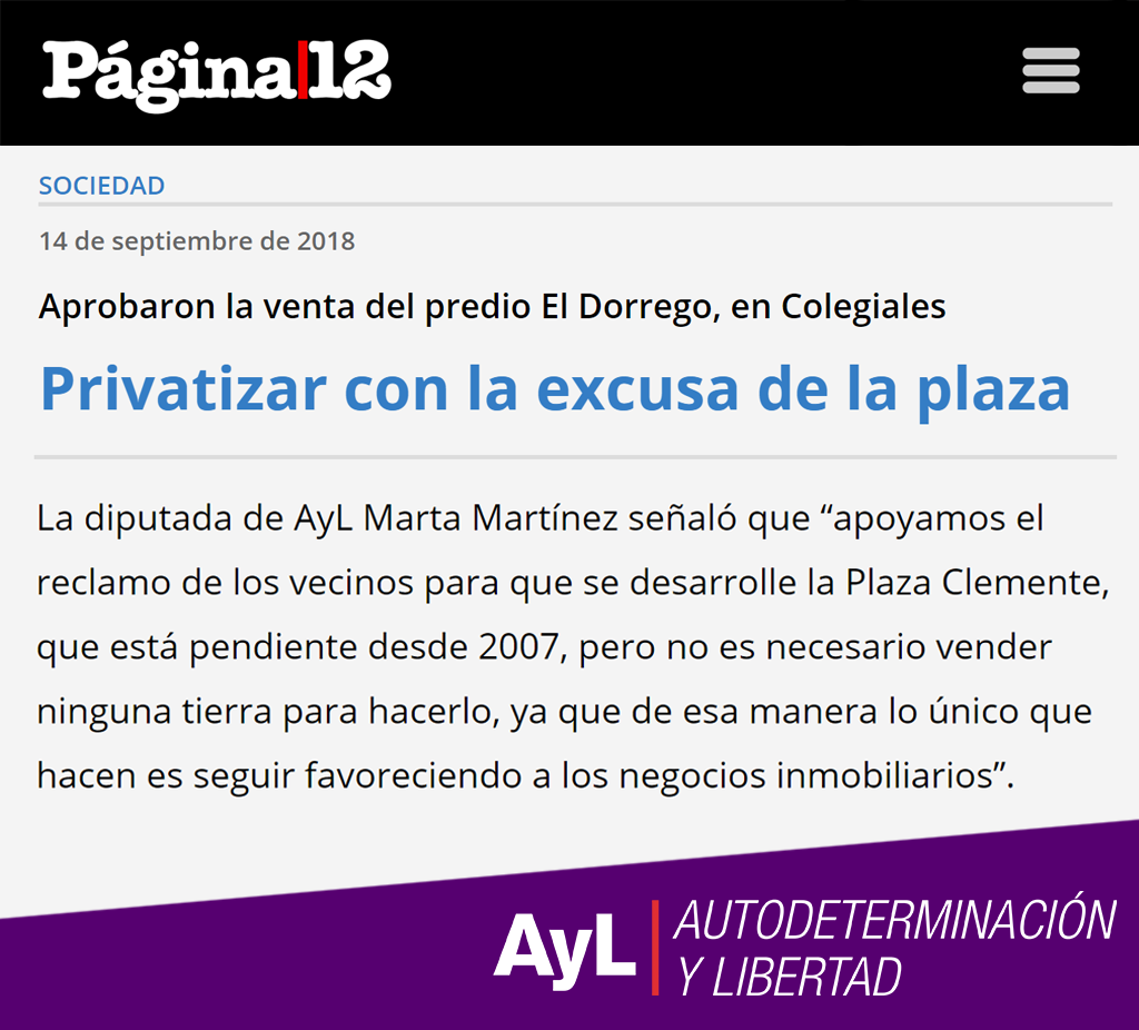 REPERCUSIONES DE LA INTERVENCIÓN DE MARTA MARTINEZ EN LA LEGISLATURA SOBRE LA PRIVATIZACIÓN DEL PREDIO DORREGO Publicado 12 octubre, 2018 · Actualizado 17 octubre, 2018 Nota completa en https://www.pagina12.com.ar/142121-privatizar-con-la-excusa-de-la-plaza Share